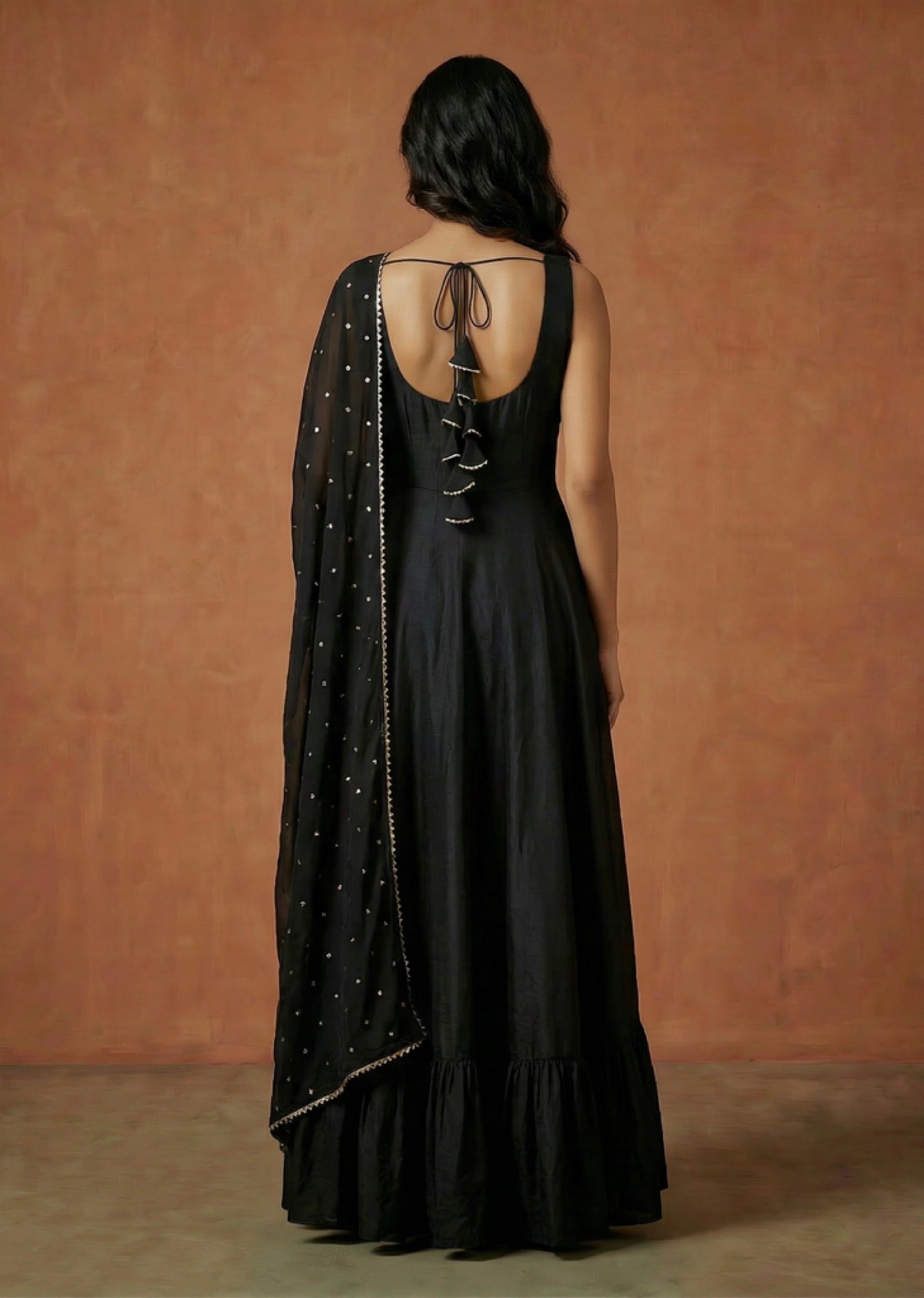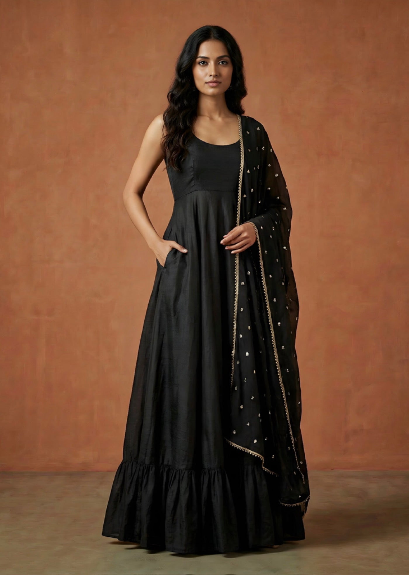 Top: This sleeveless, floor-length gown features a sleek round neckline and a structured bodice with functional side pockets. The voluminous flared skirt is finished with a gathered ruffle tier for movement. The back showcases a plunging deep-U design, fastened with a delicate dori and our signature tiered fabric latkan.
