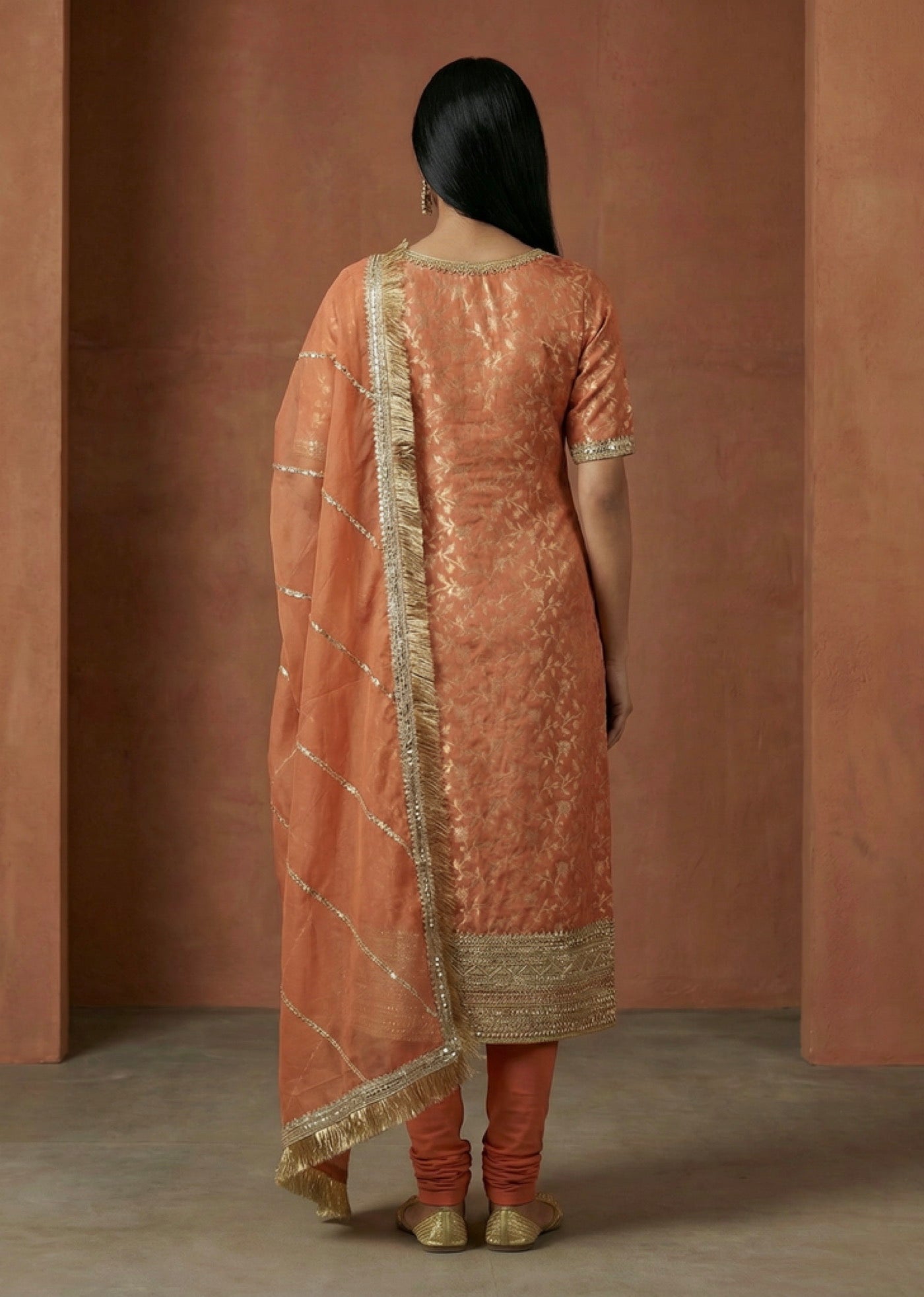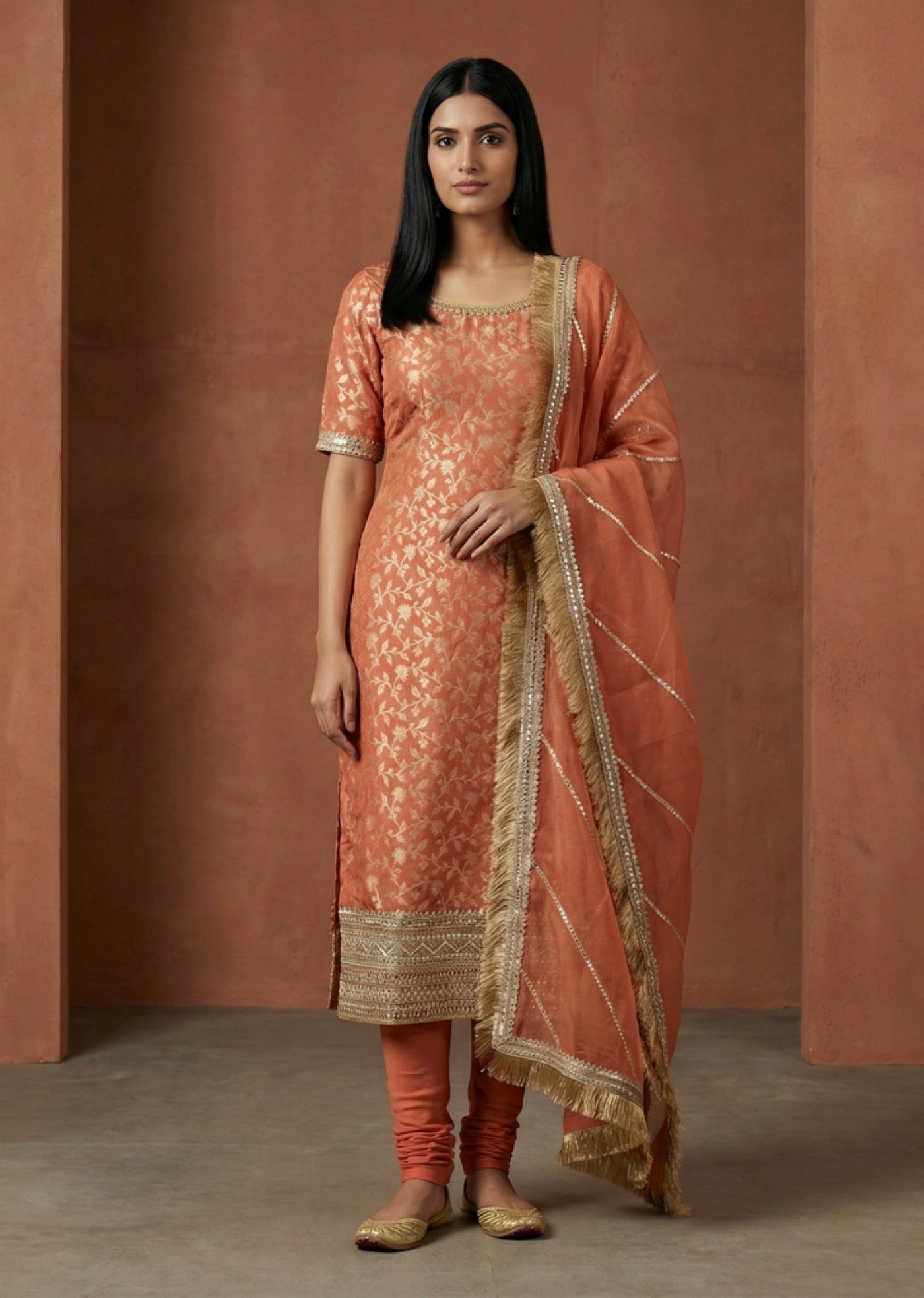 A straight-cut kameez in rich Banarasi featuring gold gota borders and a round neckline with a clean, sophisticated back - paired with a comfortable lycra churidar.