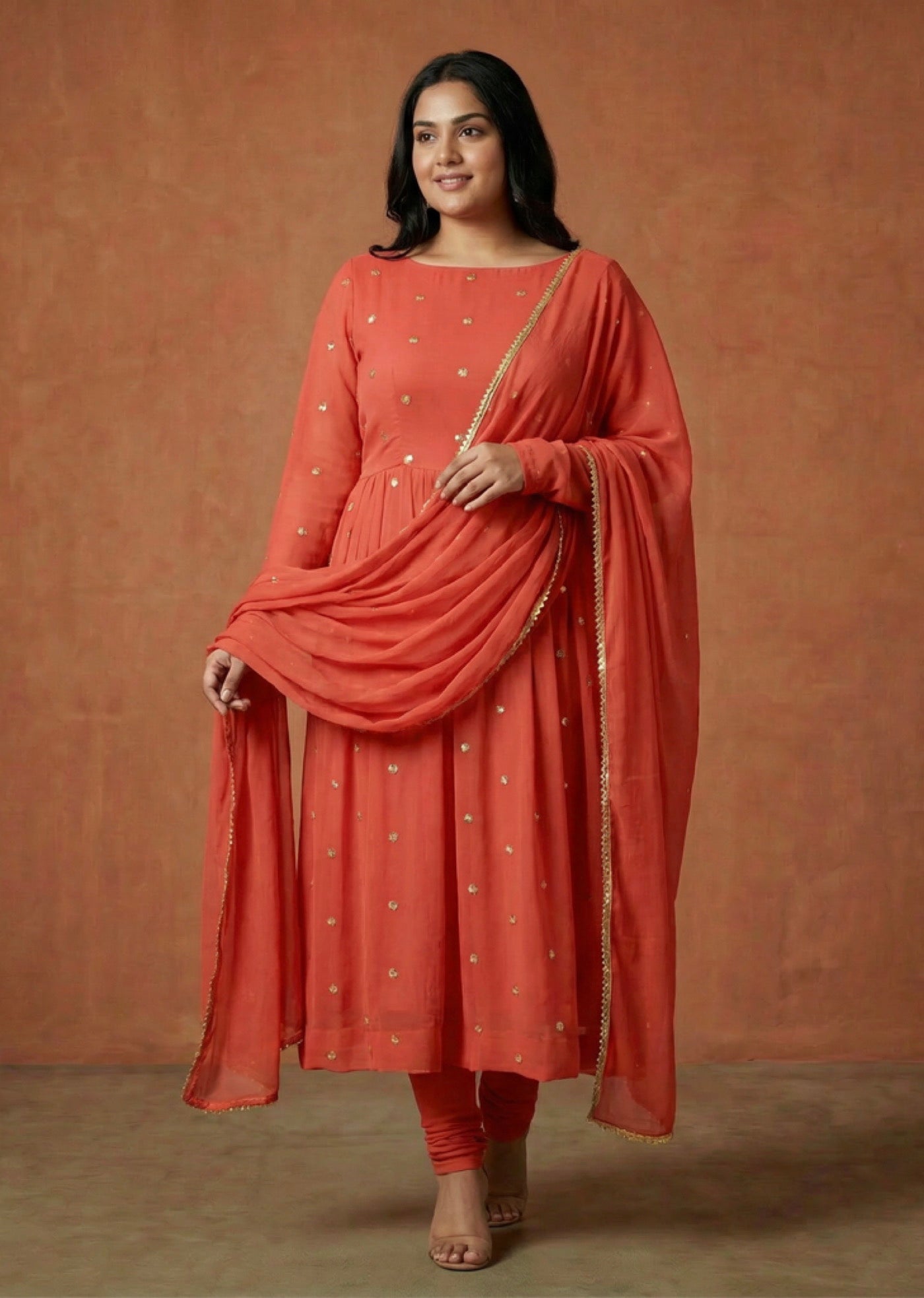 Bottom: The set is paired with matching coral churidar pants, designed for a comfortable yet tapered fit that gathers gracefully at the ankles.