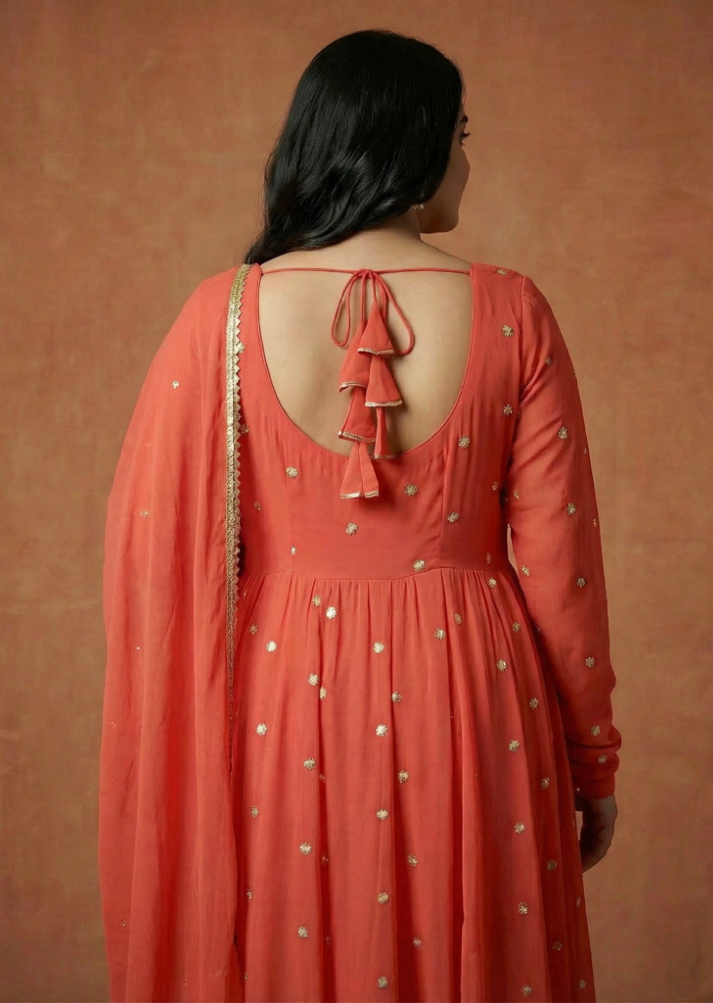 Top: A classic midi length Anarkali featuring a modest boat neckline and full-length sleeves. The piece is adorned with scattered gold sequin bootis that catch the light with every step. The back features a deep scoop design, elegantly secured with a dainty tie-up and a signature trail of tiered fabric latkans finished with gold-corded edges.