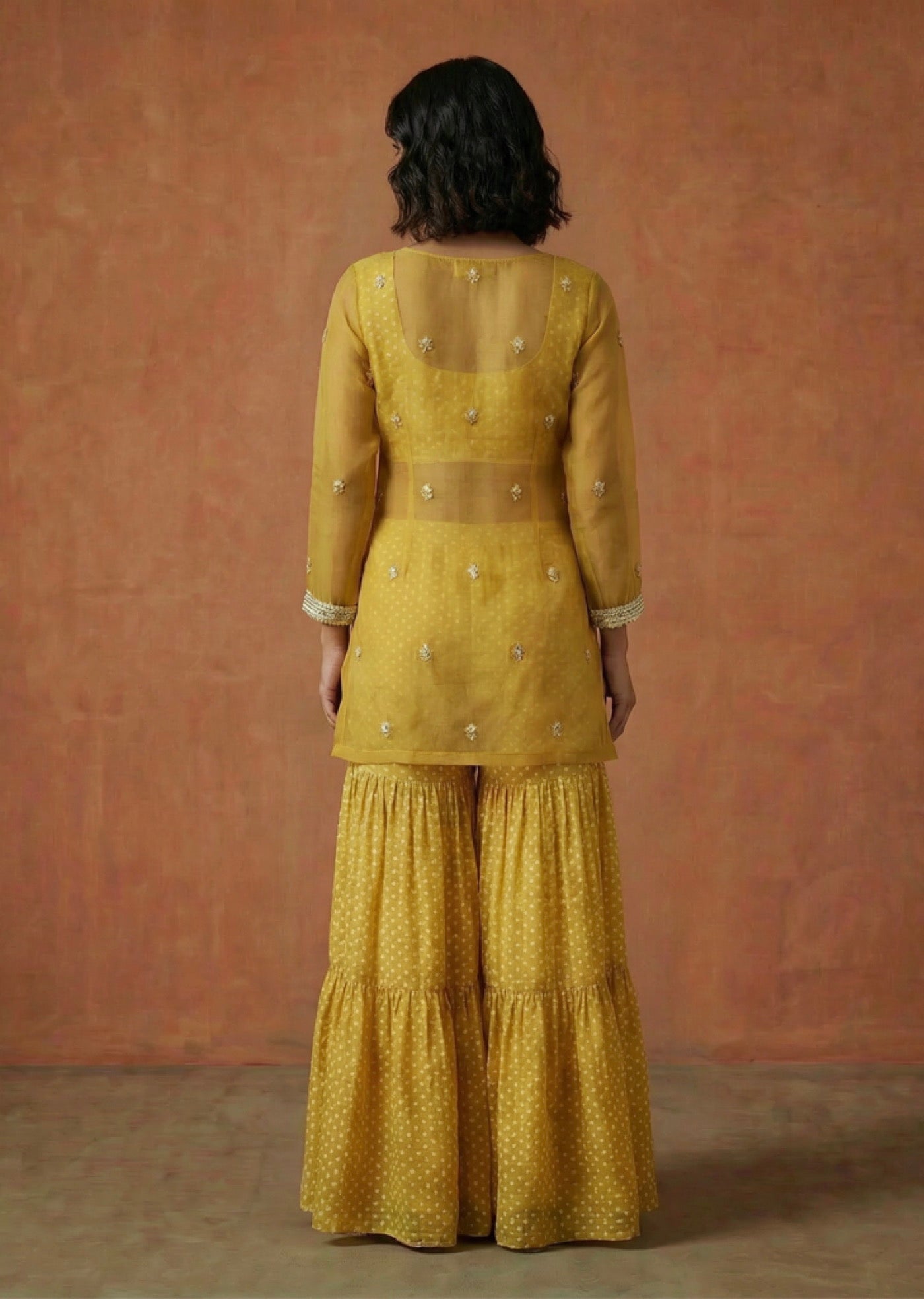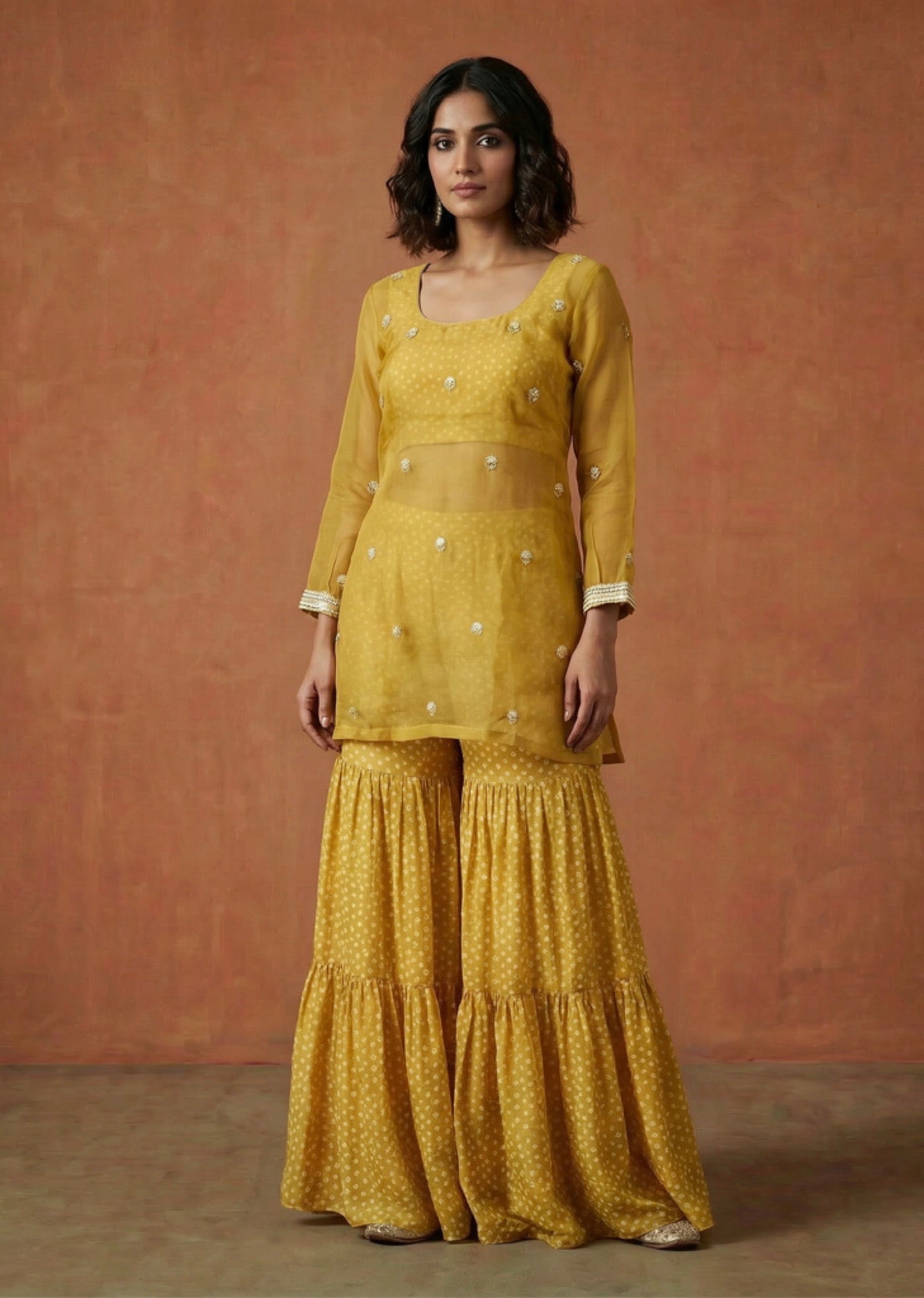 Bottom: The set is paired with voluminous, high-waisted sharara featuring a classic bandhani print. The three-tiered design creates a beautiful flared silhouette that offers fluid movement and comfort.